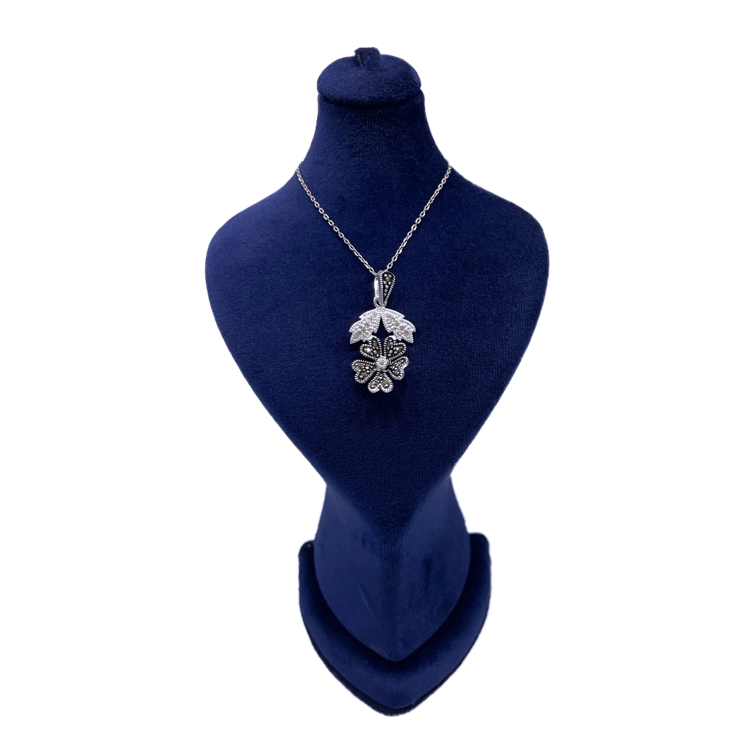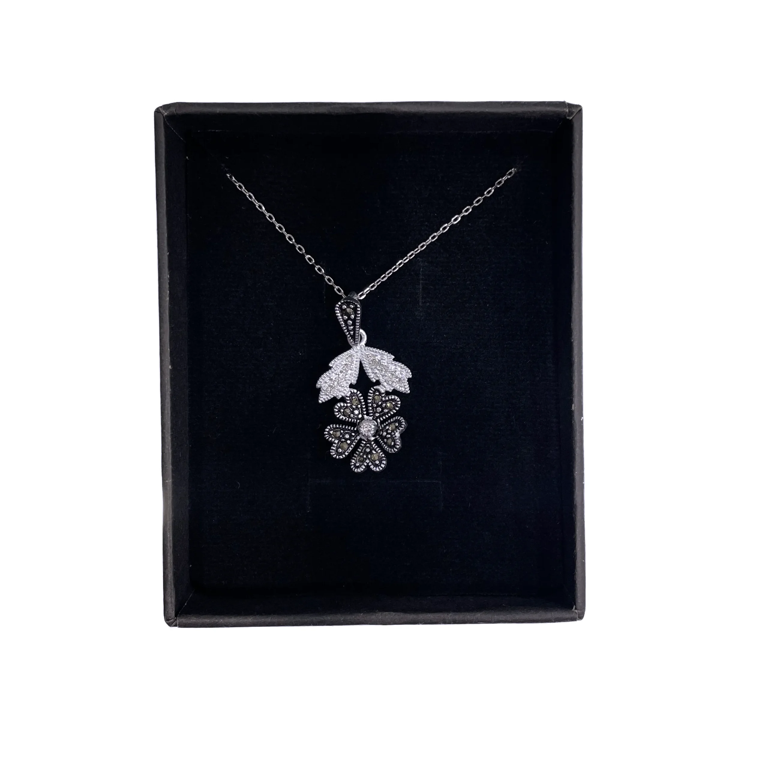 آویز زنانه نقره مارکازیت گل سفید و سیاه به سبک سیاه قلم کیفیت بسیار بالا و عیار ۹۲۵ است قیمت که مشاهده می‌کنید بدون زنجیر است و شما میتوانید آن را با زنجبر خود و یا هر زنجیر دیگری که در سایت مشاهده میکنید ( در بخش نقره – زنجیر زنانه ) برای این کار ست کنین و زنجیری که در داخل عکس قابل مشاهده است برای نشان دادن عکس است این نیمست شامل : یک مدال گردنی