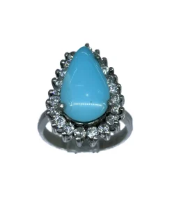 انگشتر نقره زنانه با عیار ۹۲۵ و همراه فیروزه دامغان که سنگ آن اصل میباشد و بسیار زیبا و چشم نواز میباشد دور انگشتر نیز دارای نگین های اتمی سفید است یکی از خاصیتهای محبوب فیروزه ایرانی این است که در قدیم برای استفاده از چشم نظر بود به طوری که عدهای اعتقاد دارند که فیروزه ایرانی باعث دفع انرژیهای منفی و یا چشم زخم میباشد