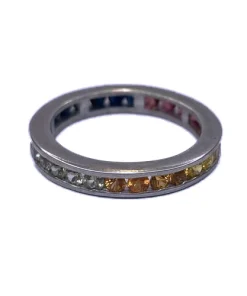 انگشتر زنانه نقره بسیار زیبا و شیک همراه با نگینهای اتمی رنگی با عیار ۹۲۵ و سایز 59 و رنگ بسیار خیره کننده این مدل بسیار زیبا و بسیار جذاب و خواستنی داخل انگشت زنانه شما بسیار زیبا و پر جلوه هست این انگشتر سبکی هست که دور تا دور آن را تمام نگین گرفته است طیف رنگی نگینهای آن از کمرنگ به پررنگ هست