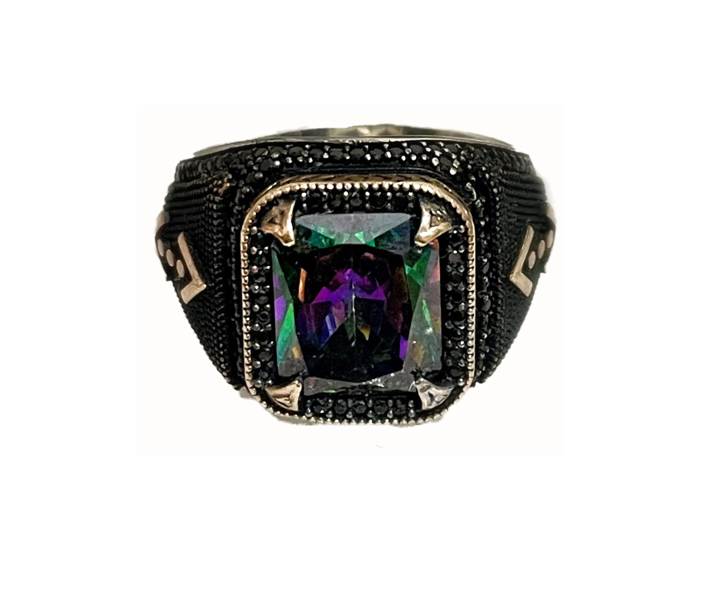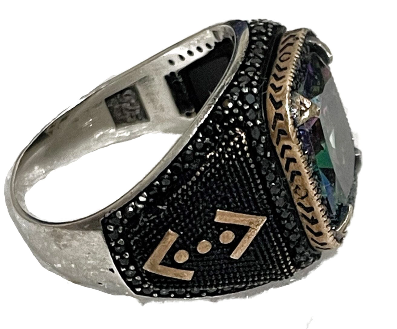 انگشنتر مردانه نقره عیار ۹۲۵ و سایز 66 کار دو رنگ همراه با نگین هفت رنگ و نگین های ریز مشکی اطراف کار بسیار زیبا و شیک