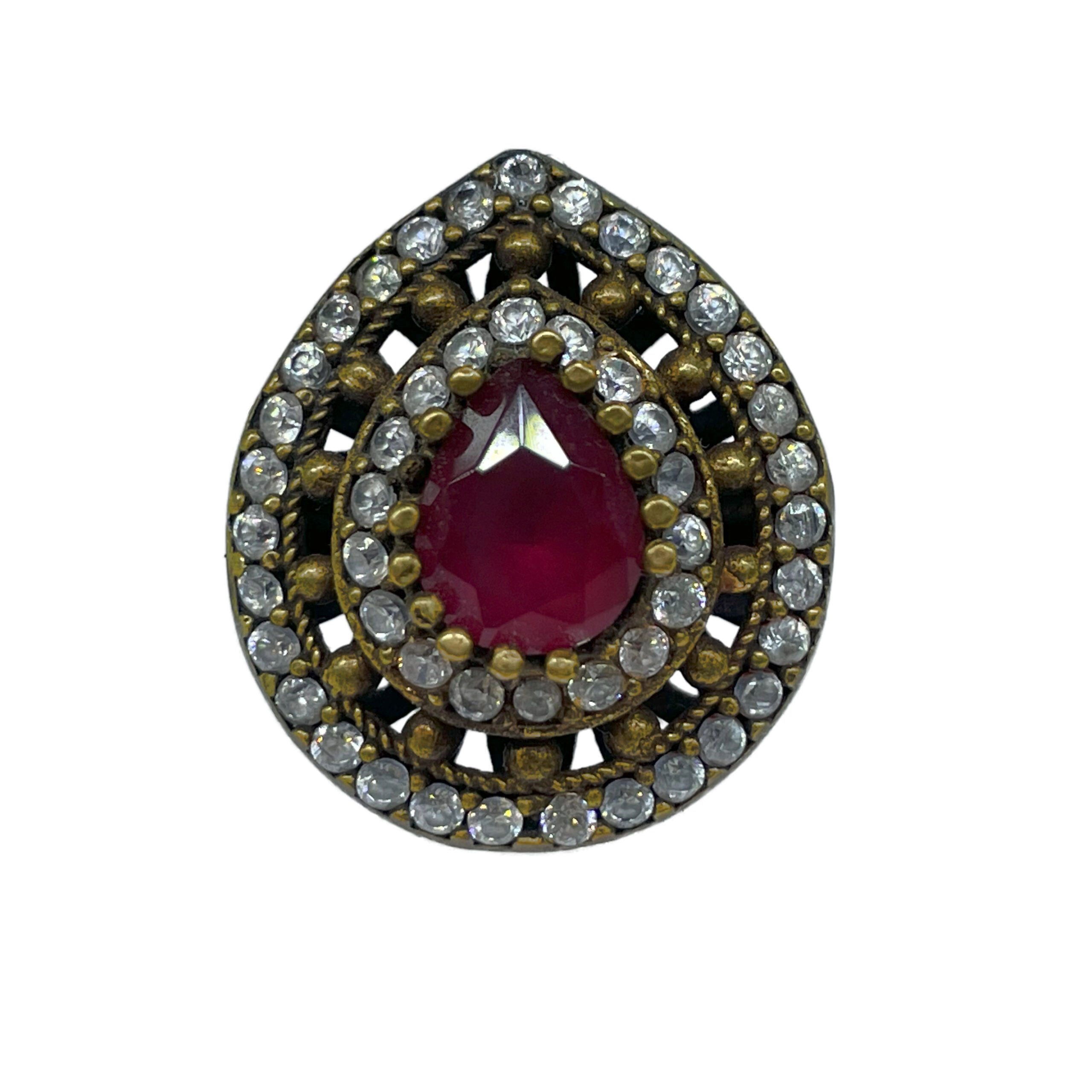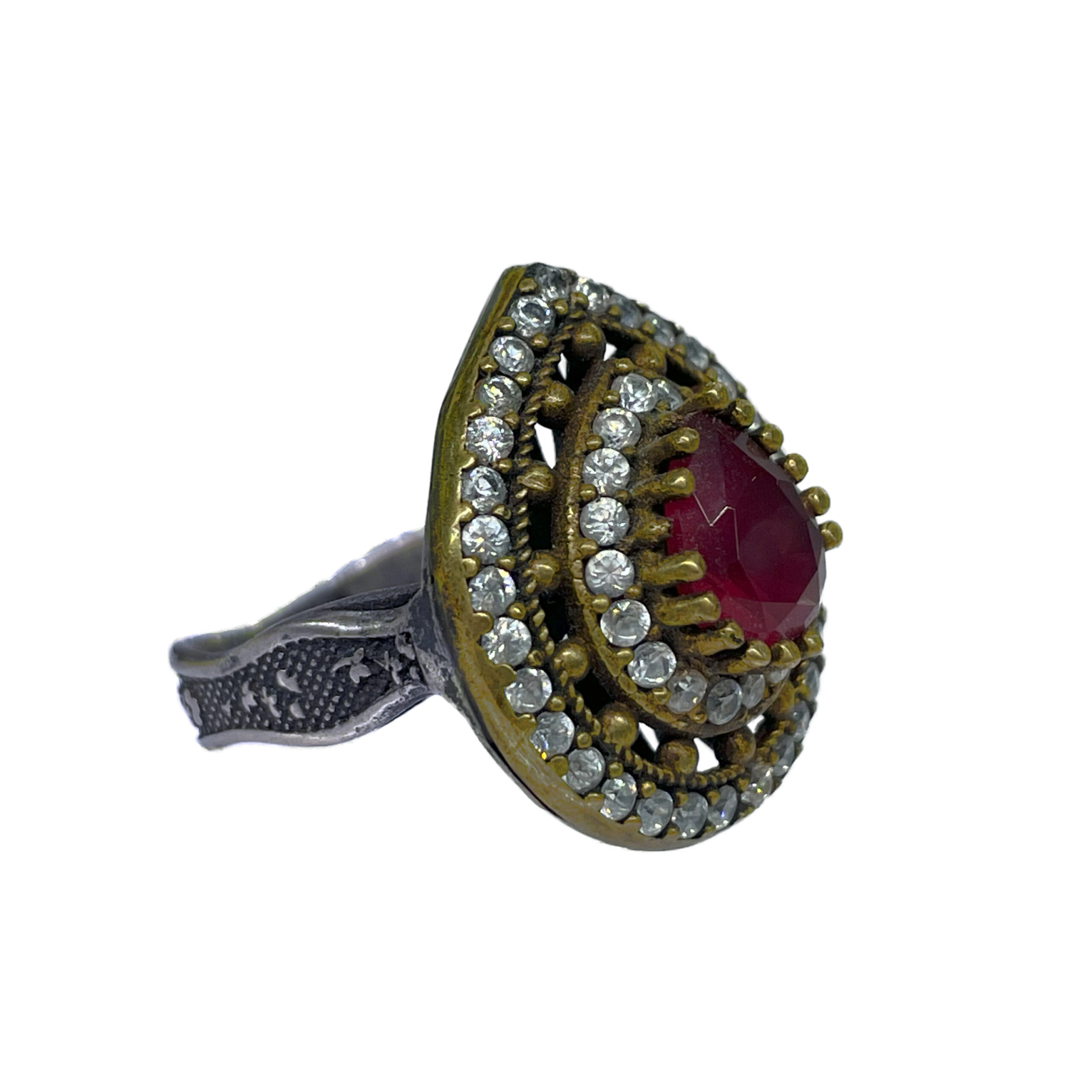 انگشتر نقره زنانه طرح عثمانی با نگین های سفید ریز اتمی و تخمه قرمز