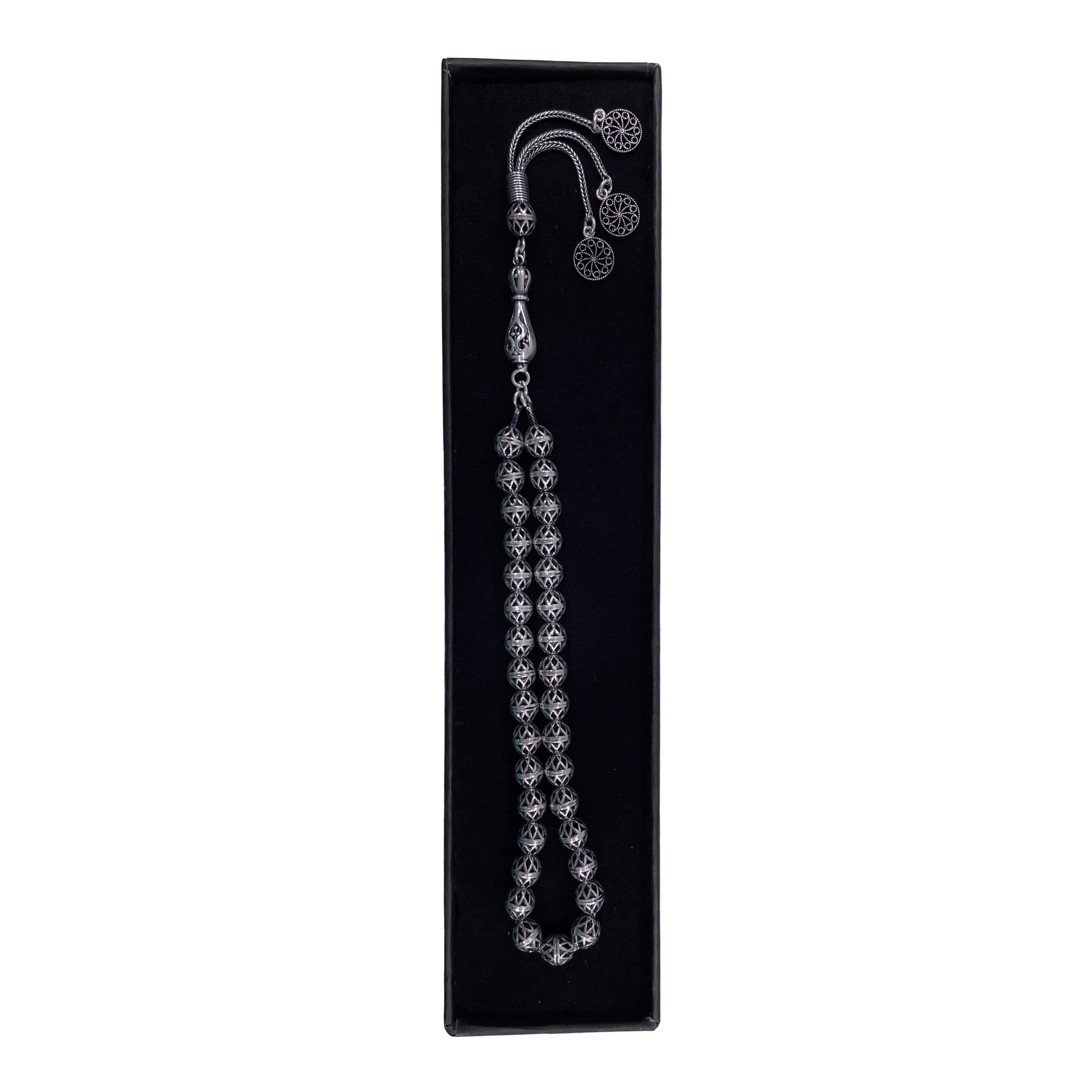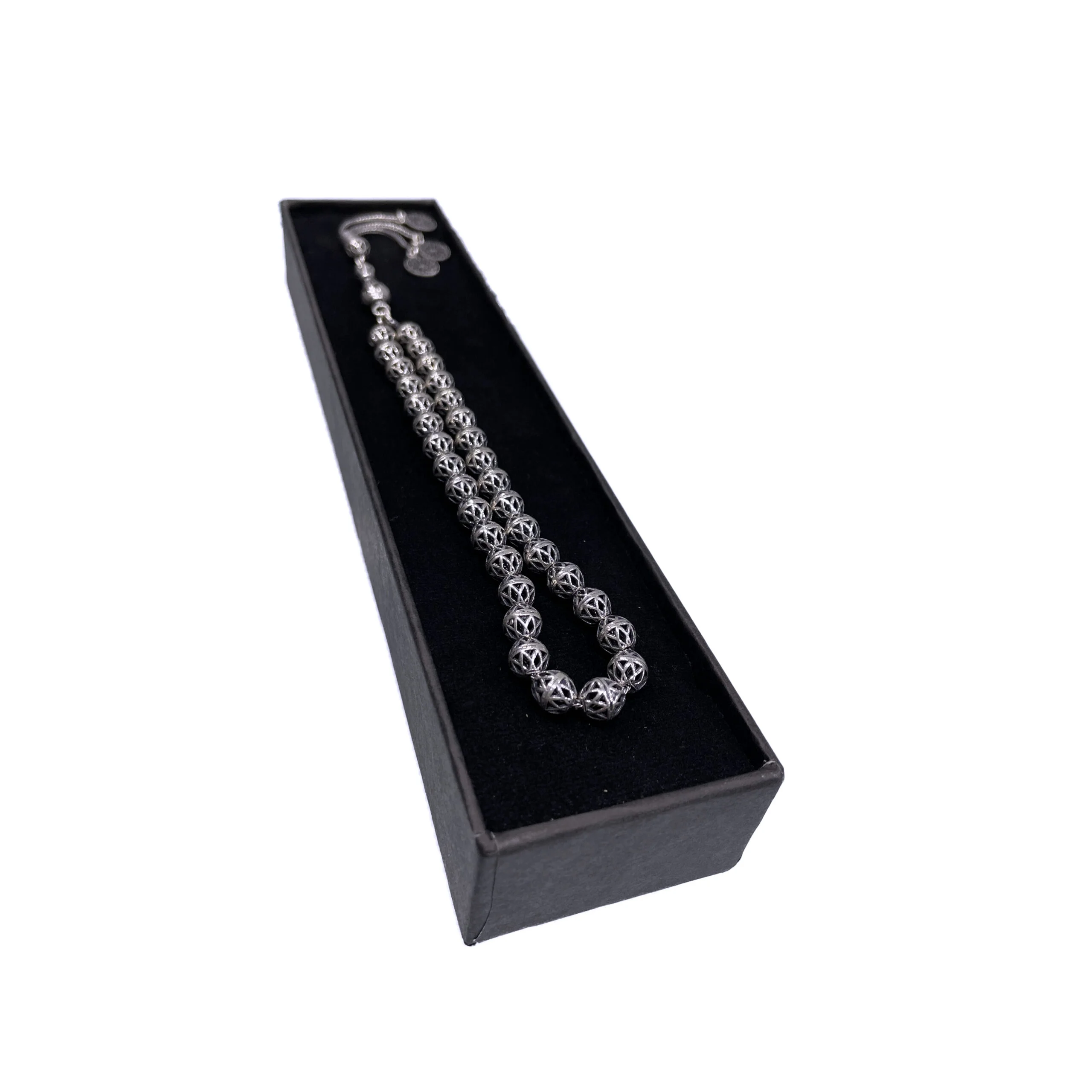 تسبیح نقره اصل با عیار 925 ( استاندارد ) و عمامه نقره که بسیار زیبا و شیک بوده و دارای پرستیژ خاص و رنگ بینظیر و شیک است که آن را متمایز می‌کند شکل دانه های این تسبیح به صورت گرد گرد سیاه قلم می‌باشد و تعداد آن ۳۳ عدد است و در ساخت آن از نخ نقره بسیار محکم برای استفاده شده است