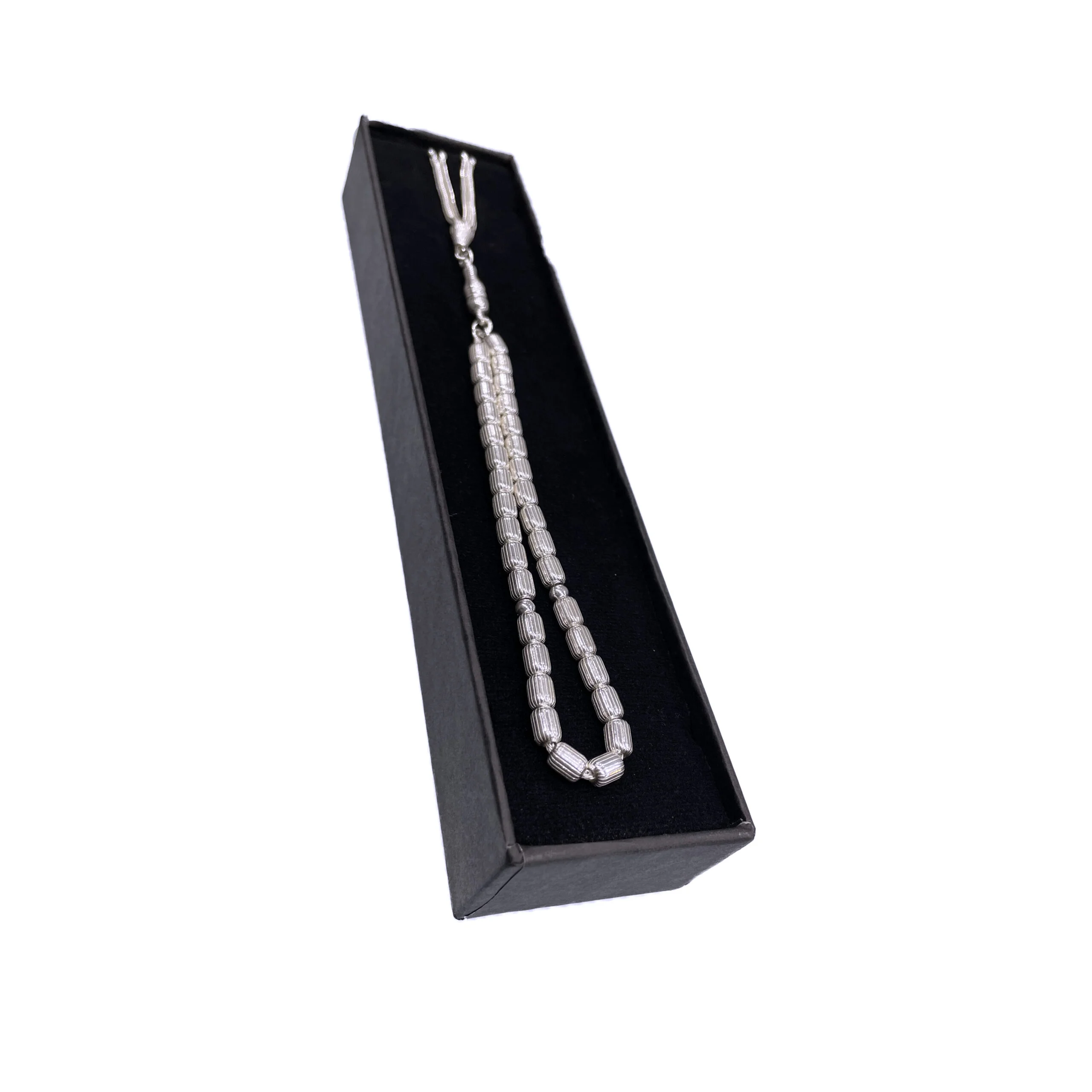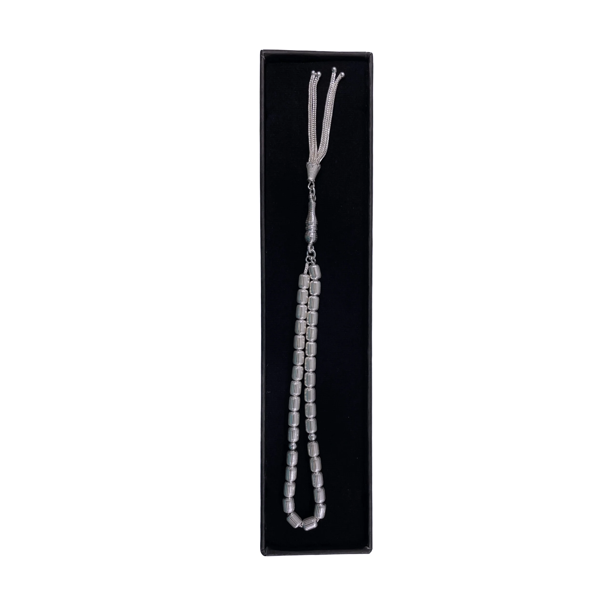 تسبیح نقره مربع تراش دار اصل با عیار 925 ( استاندارد ) و عمامه نقره که بسیار زیبا و شیک بوده و دارای پرستیژ خاص و رنگ بینظیر و شیک است که آن را متمایز میکند شکل دانه های این تسبیح به صورت مربع مربع و تراش دار میباشد و تعداد آن ۳۳ عدد است و در ساخت آن از نخ نقره بسیار محکم برای استفاده شده است