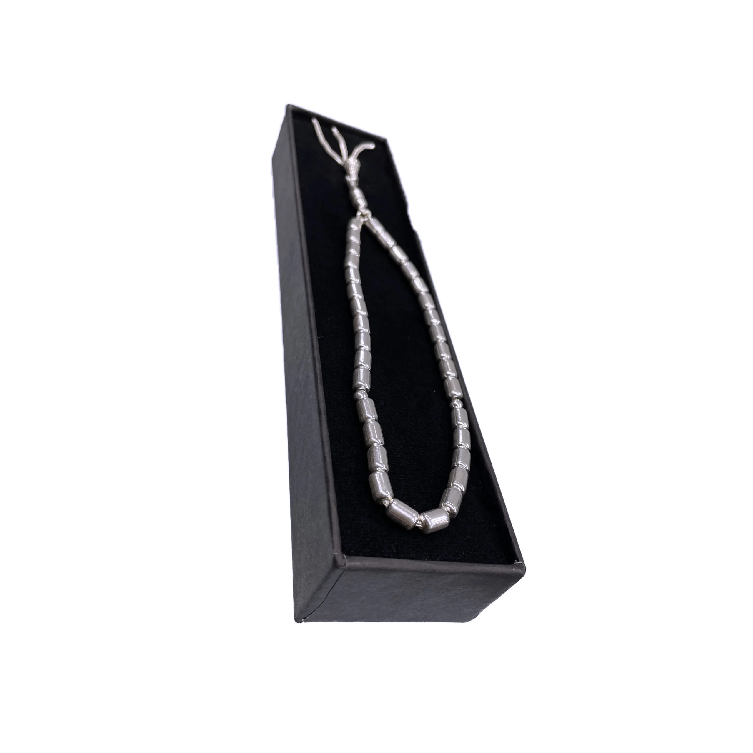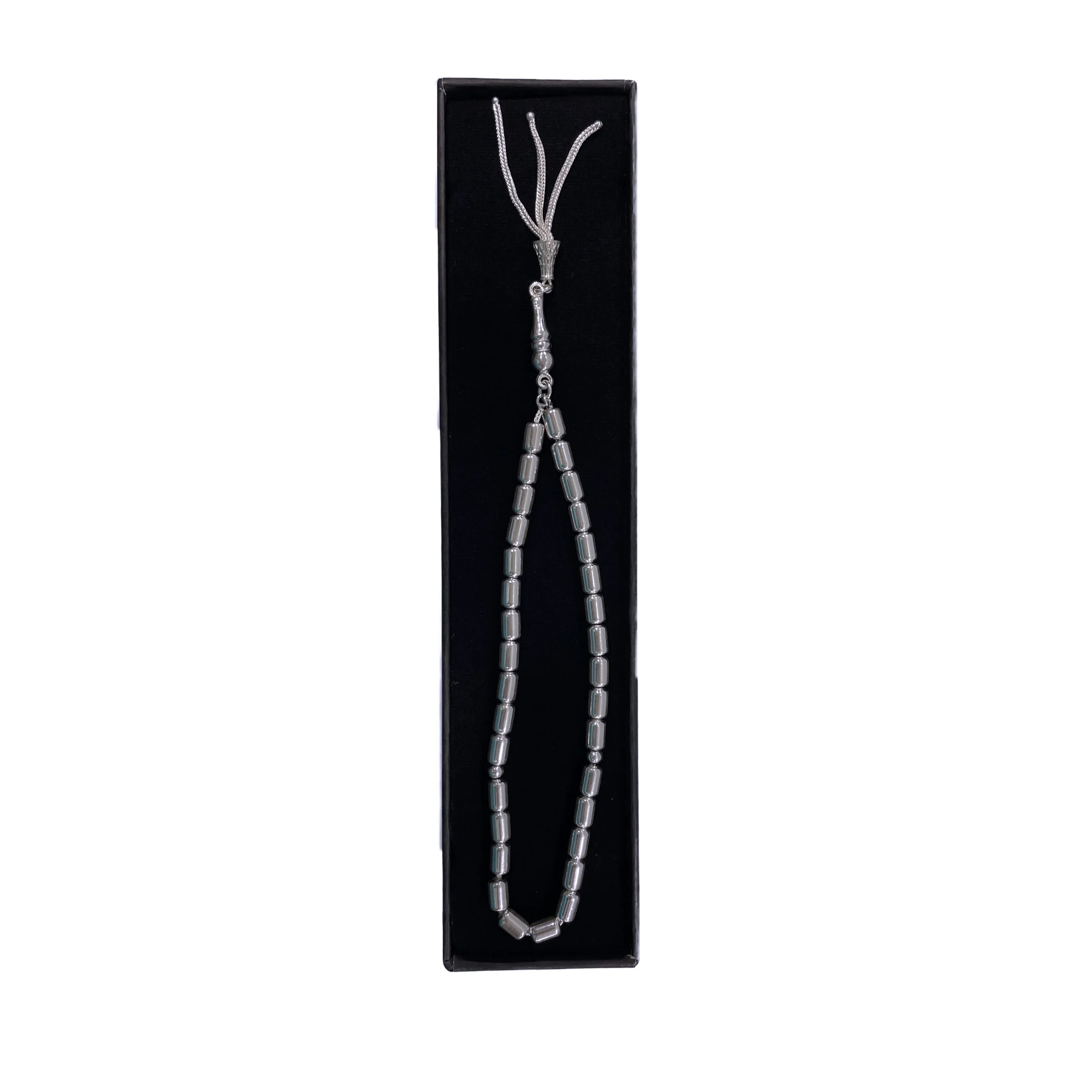 تسبیح نقره اصل با عیار 925 ( استاندارد ) و عمامه نقره که بسیار زیبا و شیک بوده و دارای پرستیژ خاص و رنگ بینظیر و شیک است که آن را متمایز میکند شکل دانه های این تسبیح به صورت مربع مربع میباشد و تعداد آن ۳۳ عدد است و در ساخت آن از نخ نقره بسیار محکم برای استفاده شده است