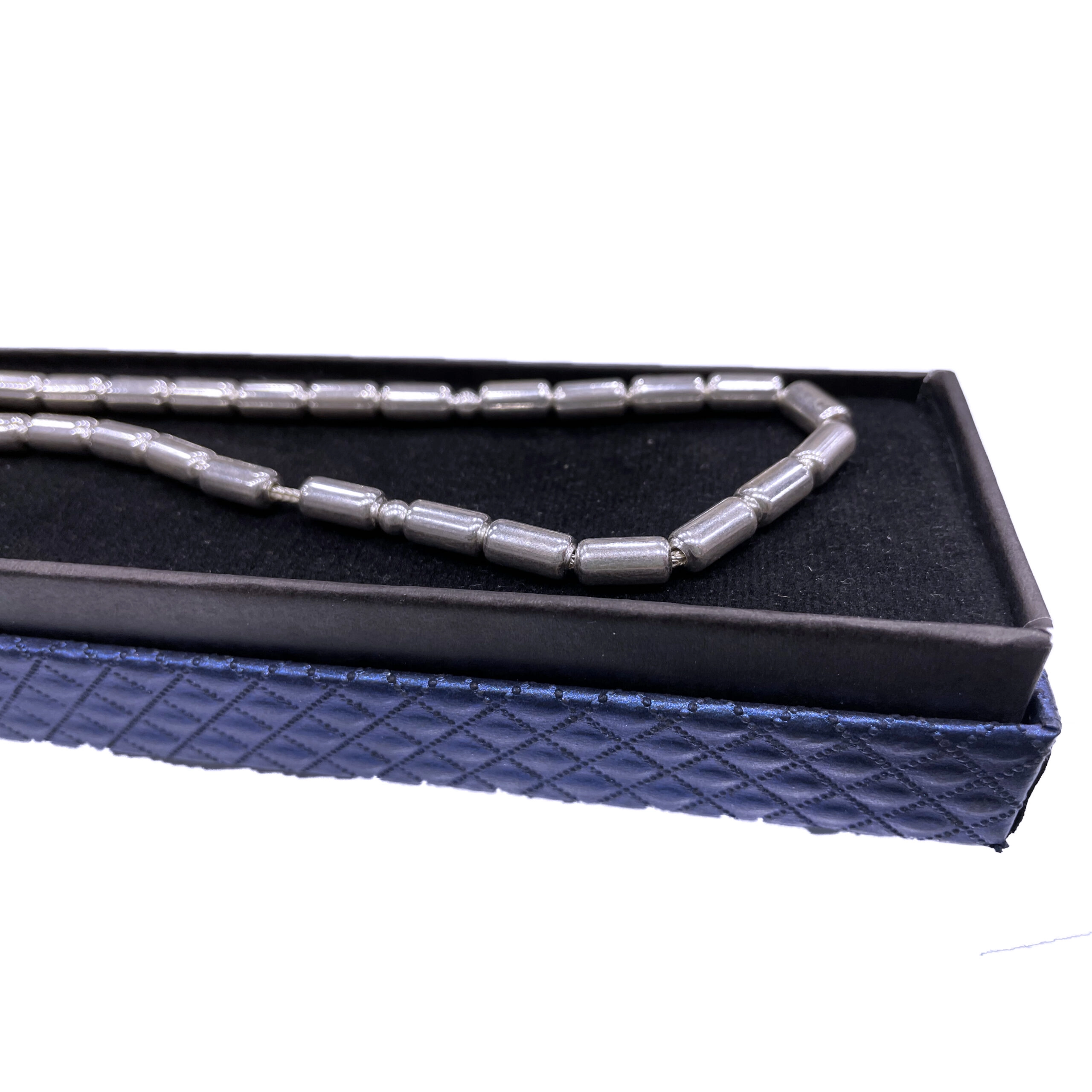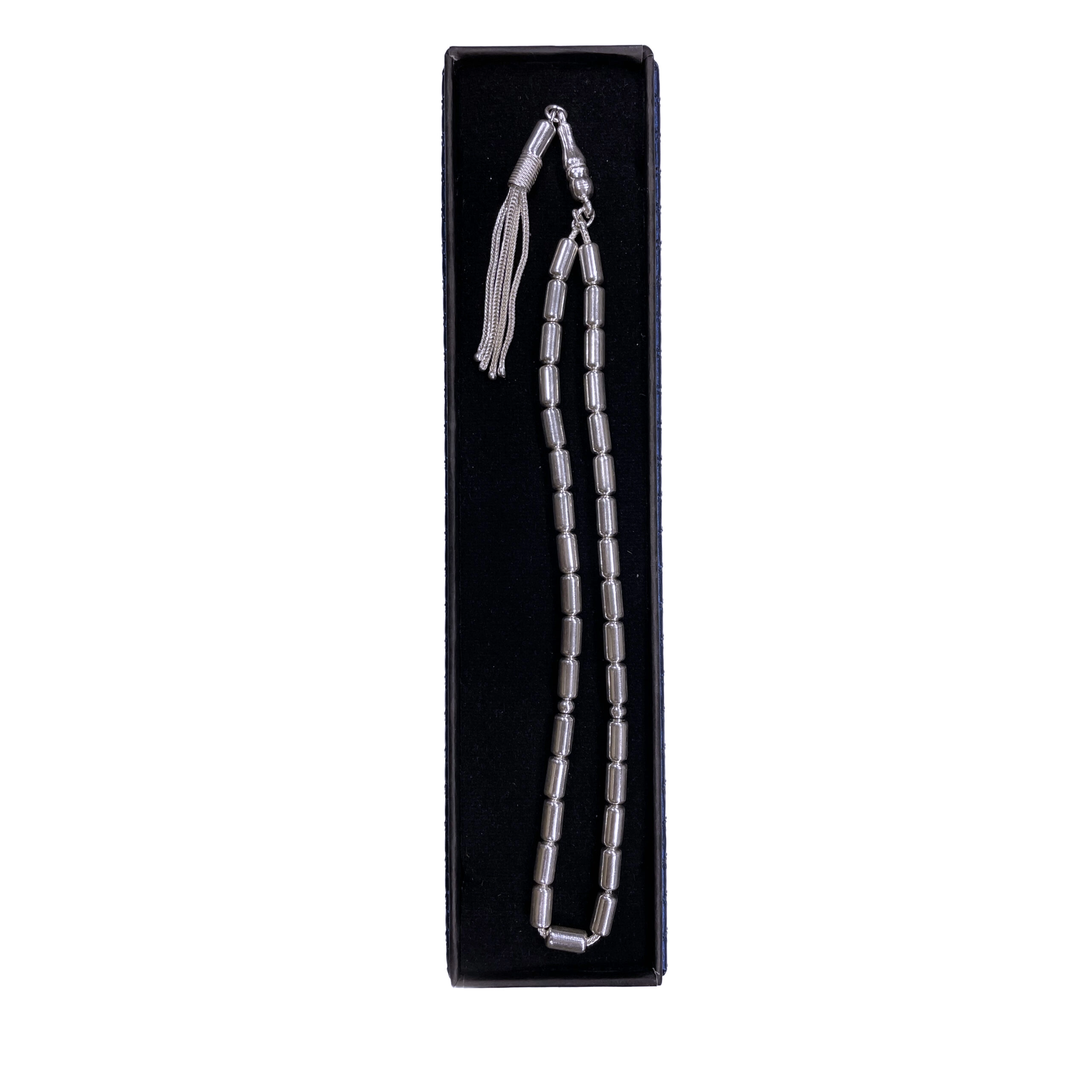 تسبیح نقره اصل با عیار 925 ( استاندارد ) و عمامه نقره که بسیار زیبا و شیک بوده و دارای پرستیژ خاص و رنگ بینظیر و شیک است که آن را متمایز میکند شکل دانه های این تسبیح به صورت مربع مربع میباشد و تعداد آن ۳۳ عدد است و در ساخت آن از نخ نقره بسیار محکم برای استفاده شده است