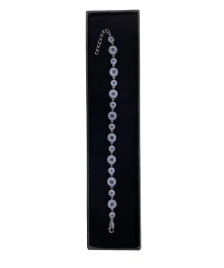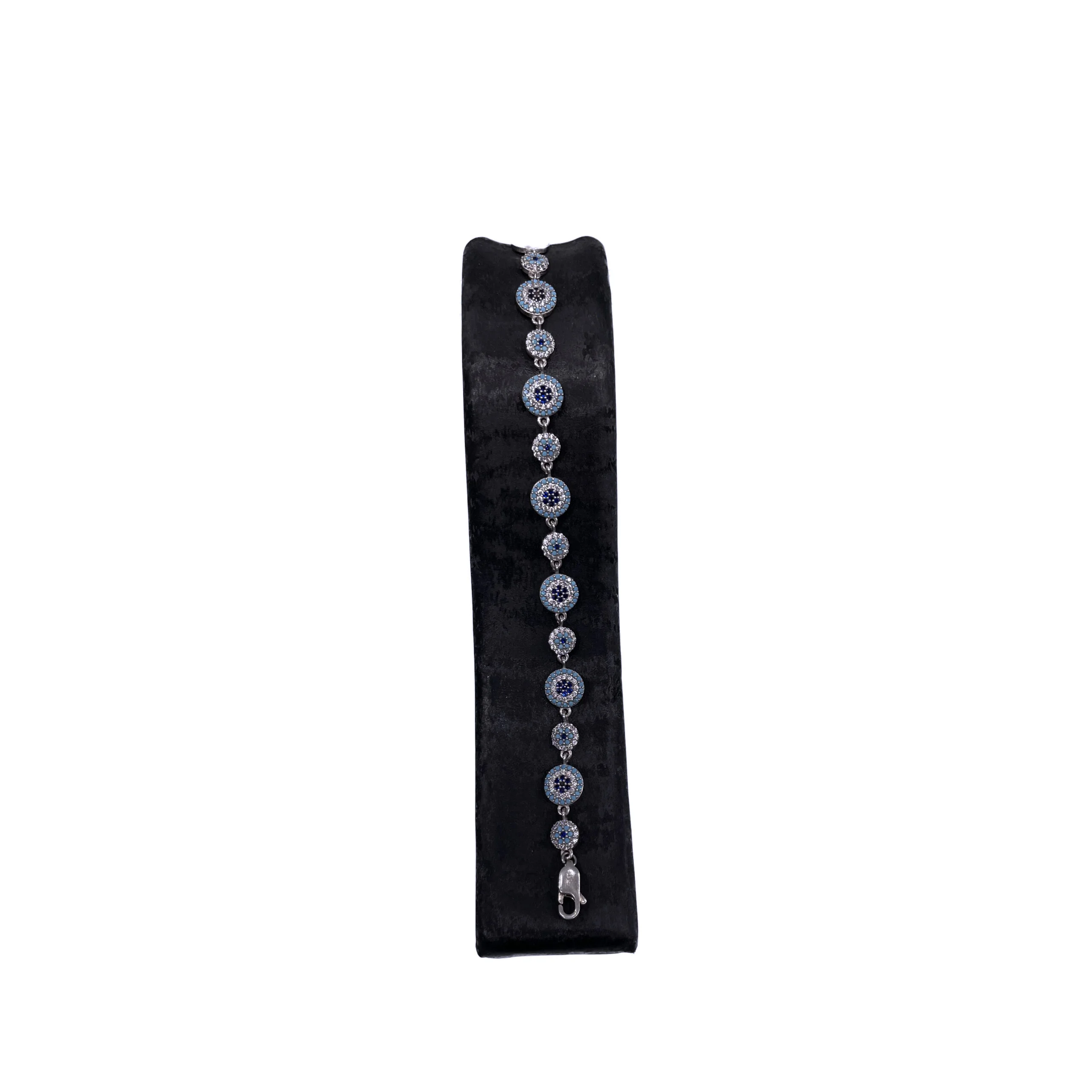 دستبند نقره زنانه طرح جواهر تنیسی نگین های سغید و آبی و کبود تراش گرد بسیار زیبا و شیک میباشد و نگین به کار رفته در آن بسیار با کیفیت و از نوع اتمی سفید میباشد پوشش این دستبند پوشش آب رادیوم میباشد که باعث دیرتر کدر شدن و سیاه نشدن این دستبند در مدت طولانی میشود