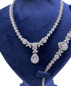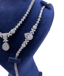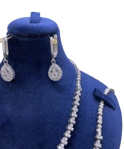 سرویس زنانه نقره طرح جواهر مدل اشک دارای سنگ های اتمی ریز بسیار زیبا و شیک که نگینهای اتمی ریز این سرویس همان نگین هایی است که در طلا استفاده میشود که به جای برلیان استفاده میشود که کیفیت نگینها به مرور زمان کم نمیشود و نه کدر میشود این سرویس دارای آب رادیوم و یا آب طلا سفید میباشد که مانع است کدری و یا تیرگی این سرویس میشود این کار بسیار با کیفیت و خاص میباشد و طراحی آن از طراحیهای برتر دنیا و کارهای ژورنالی هست این سرویس پیشنهاد ویژهای برای خانمها و یا دختر خانمهای سخت پسند و مشکل پسند میباشد