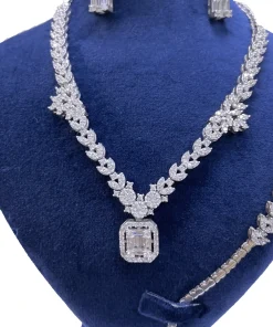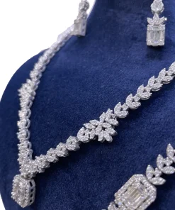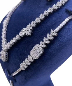 سرویس زنانه نقره طرح جواهر مدل امرال کات خوشه ای دارای سنگ های اتمی ریز بسیار زیبا و شیک که نگینهای اتمی ریز این سرویس همان نگین هایی است که در طلا استفاده میشود که به جای برلیان استفاده میشود که کیفیت نگینها به مرور زمان کم نمیشود و نه کدر میشود این سرویس دارای آب رادیوم و یا آب طلا سفید میباشد که مانع است کدری و یا تیرگی این سرویس میشود این کار بسیار با کیفیت و خاص میباشد و طراحی آن از طراحیهای برتر دنیا و کارهای ژورنالی هست این سرویس پیشنهاد ویژهای برای خانمها و یا دختر خانمهای سخت پسند و مشکل پسند میباشد