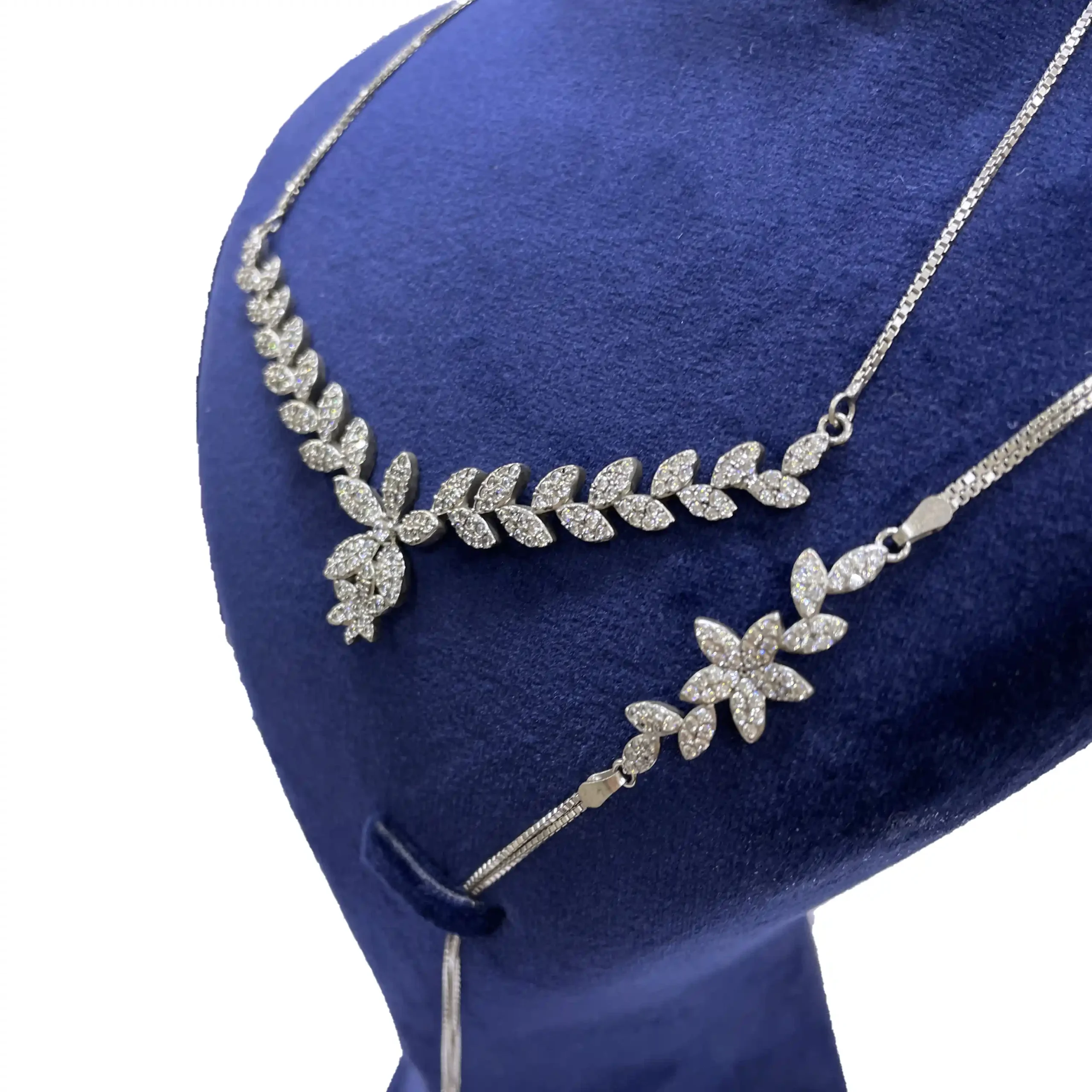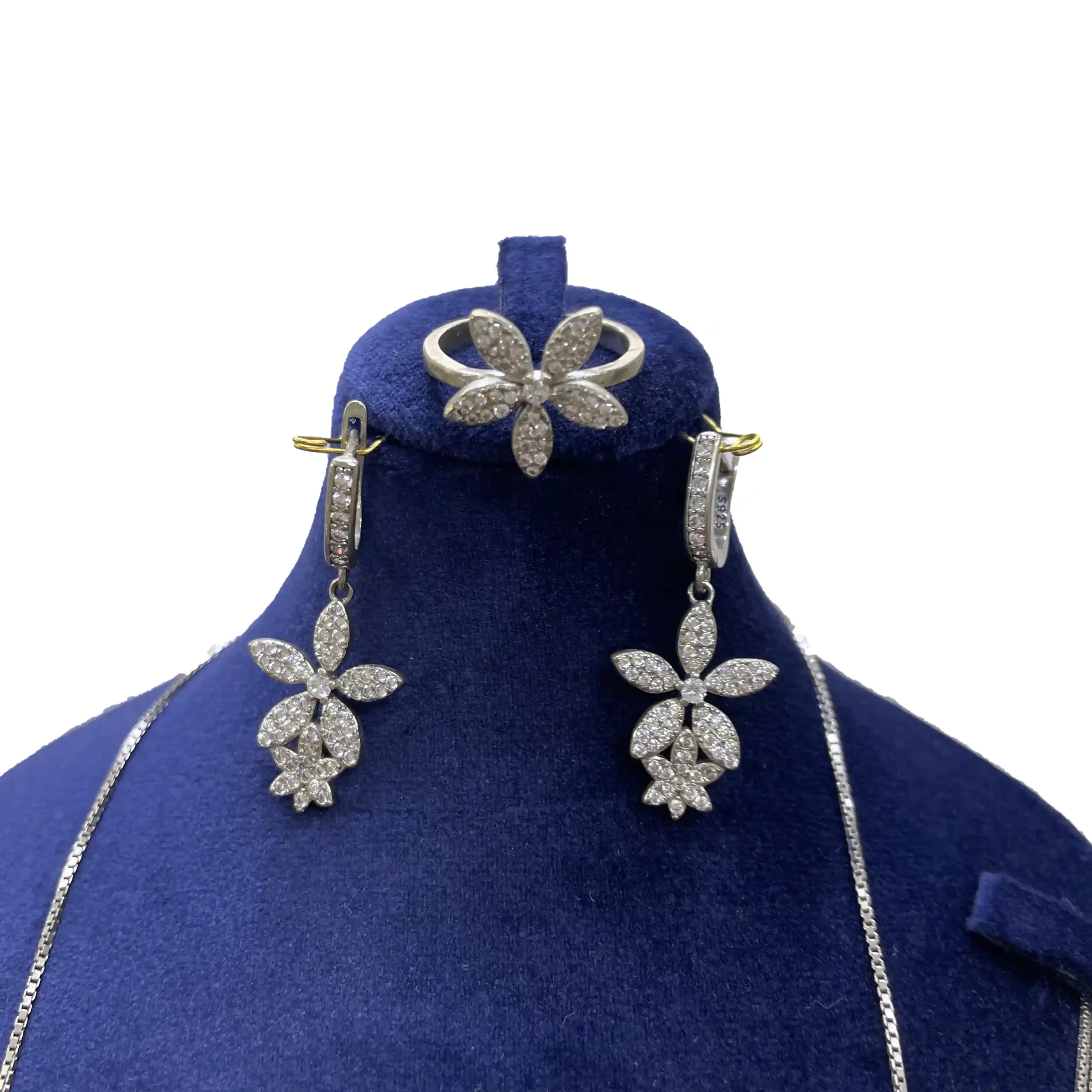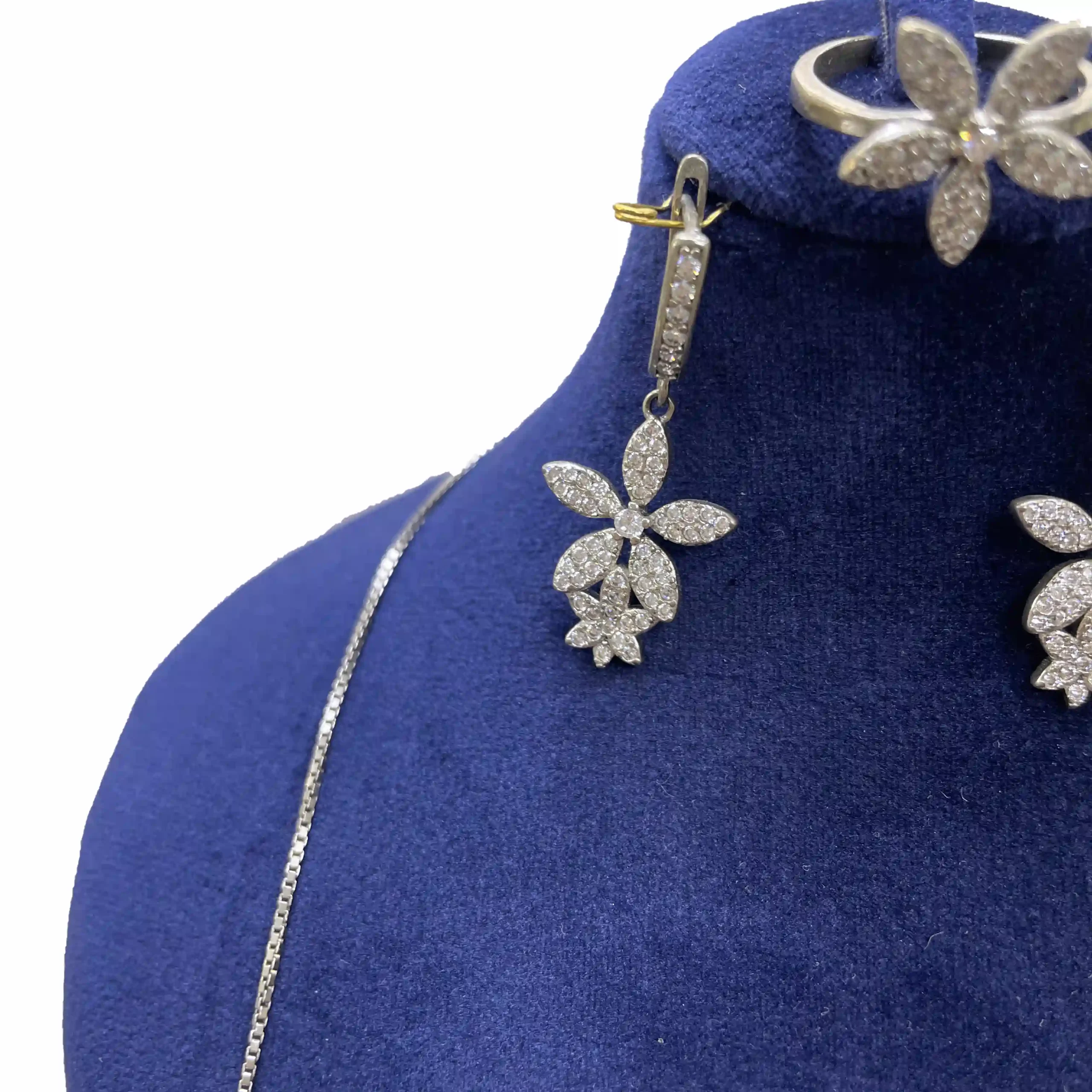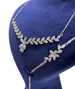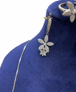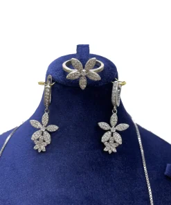 سرویس زنانه نقره طرح جواهر مدل گلچین دارای سنگ های اتمی ریز بسیار زیبا و شیک که طرح گل میباشد نگینهای اتمی ریز این سرویس همان نگین هایی است که در طلا استفاده میشود که به جای برلیان استفاده میشود که کیفیت نگینها به مرور زمان کم نمیشود و نه کدر میشود و مدل زنجیر این سرویس مدل ونیزی است که به خود سرویس متصل لست این سرویس دارای آب رادیوم و یا آب طلا سفید میباشد که مانع است کدری و یا تیرگی این سرویس میشود این کار بسیار با کیفیت و خاص میباشد و طراحی آن از طراحیهای برتر دنیا و کارهای ژورنالی هست این سرویس پیشنهاد ویژهای برای خانمها و یا دختر خانمهای سخت پسند و مشکل پسند میباشد