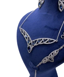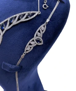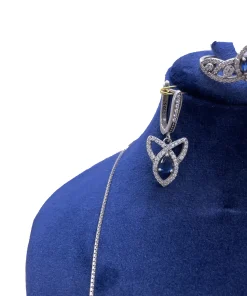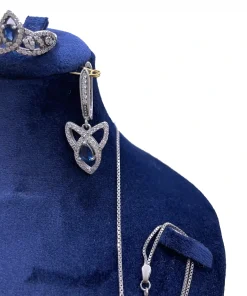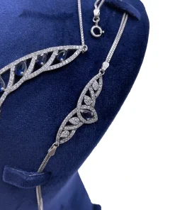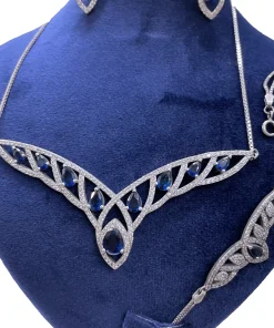 سرویس زنانه نقره طرح جواهر مدل chi chak دارای سنگ های اتمی ریز سفید و تخمه های آبی کبود بسیار زیبا و شیک که طرح گل میباشد نگینهای اتمی ریز این سرویس همان نگین هایی است که در طلا استفاده میشود که به جای برلیان استفاده میشود که کیفیت نگینها به مرور زمان کم نمیشود و نه کدر میشود و مدل زنجیر این سرویس مدل ونیزی است که به خود سرویس متصل لست این سرویس دارای آب رادیوم و یا آب طلا سفید میباشد که مانع است کدری و یا تیرگی این سرویس میشود این کار بسیار با کیفیت و خاص میباشد و طراحی آن از طراحیهای برتر دنیا و کارهای ژورنالی هست این سرویس پیشنهاد ویژهای برای خانمها و یا دختر خانمهای سخت پسند و مشکل پسند میباشد