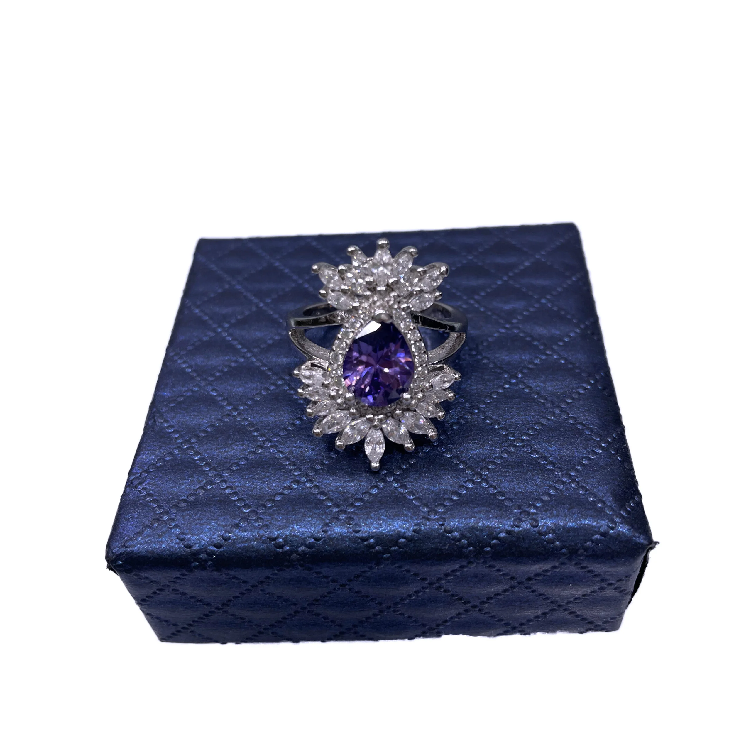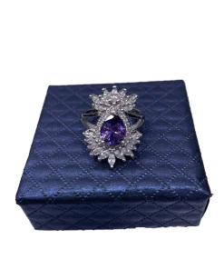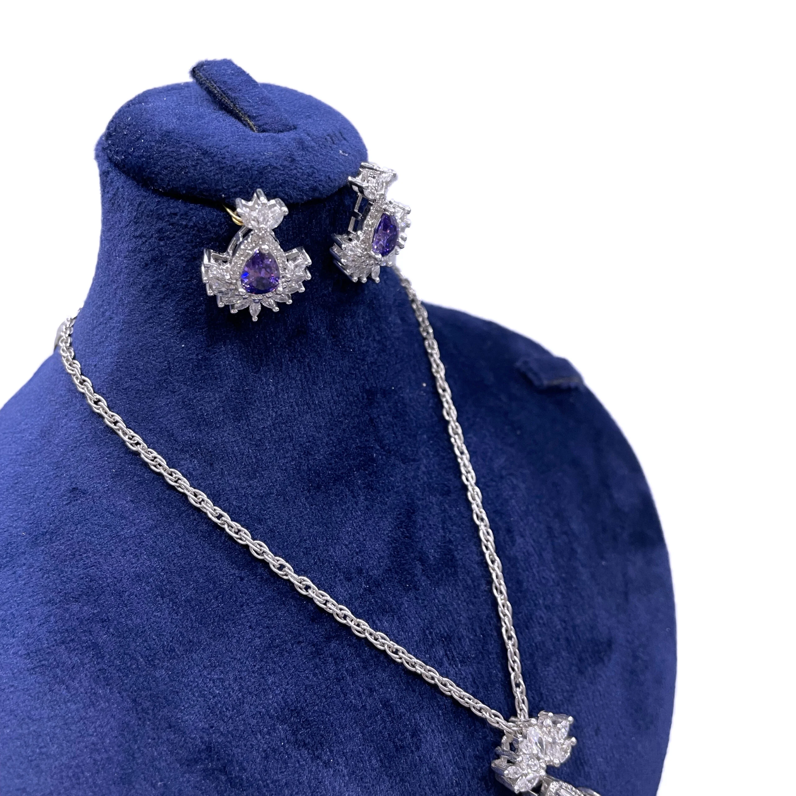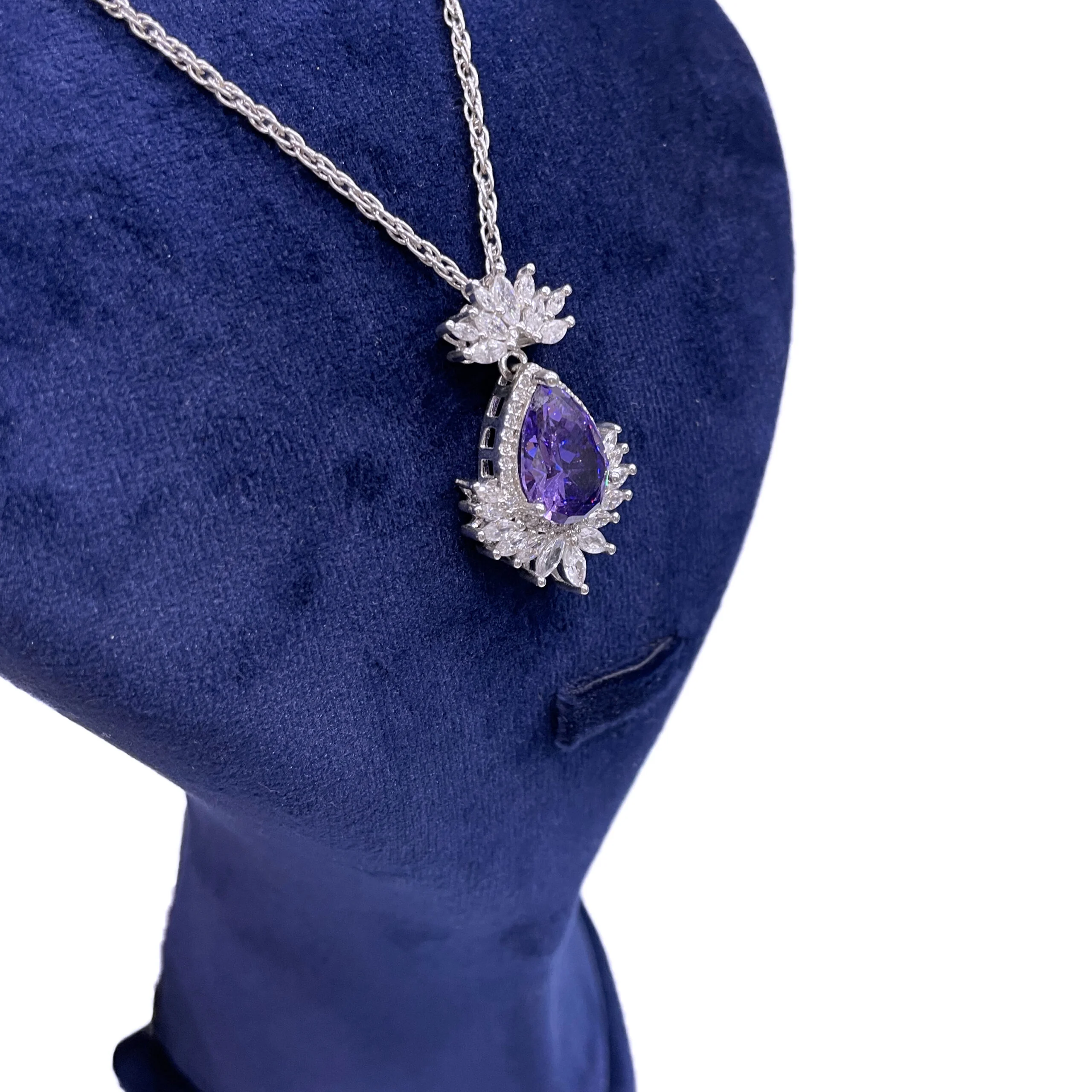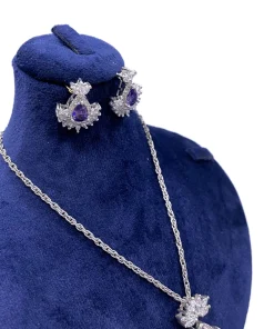نیم ست زنانه نقره طرح جواهر مدل شاینی آب رادیوم همراه با نگین های اتمی سفید و تخمه های بنفش ( طرح آماتیس )بدون زنجیر