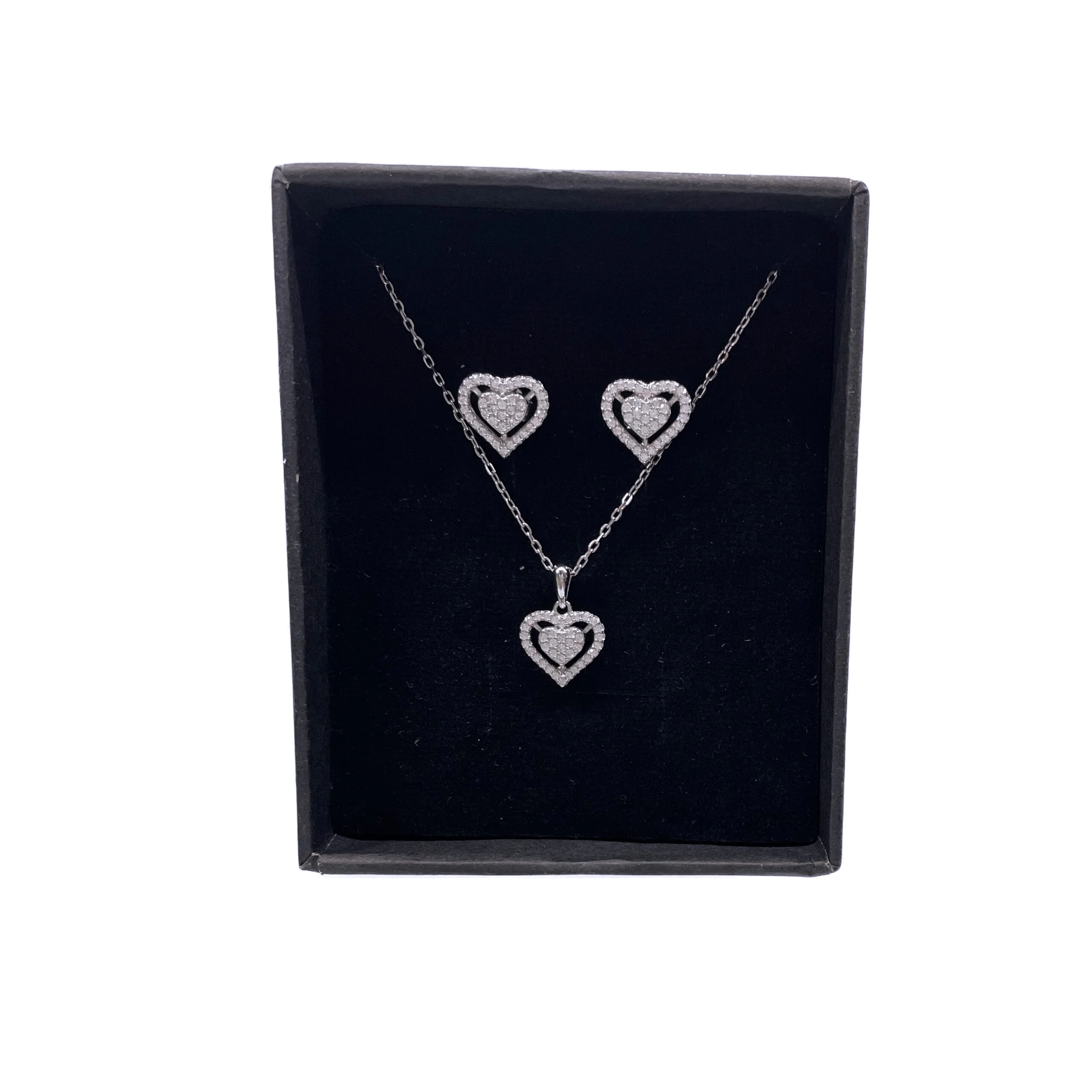 نیم ست زنانه نقره طرح قلب پر نگین آب رادیوم همراه با نگین های اتمی سفید بدون زنجیر