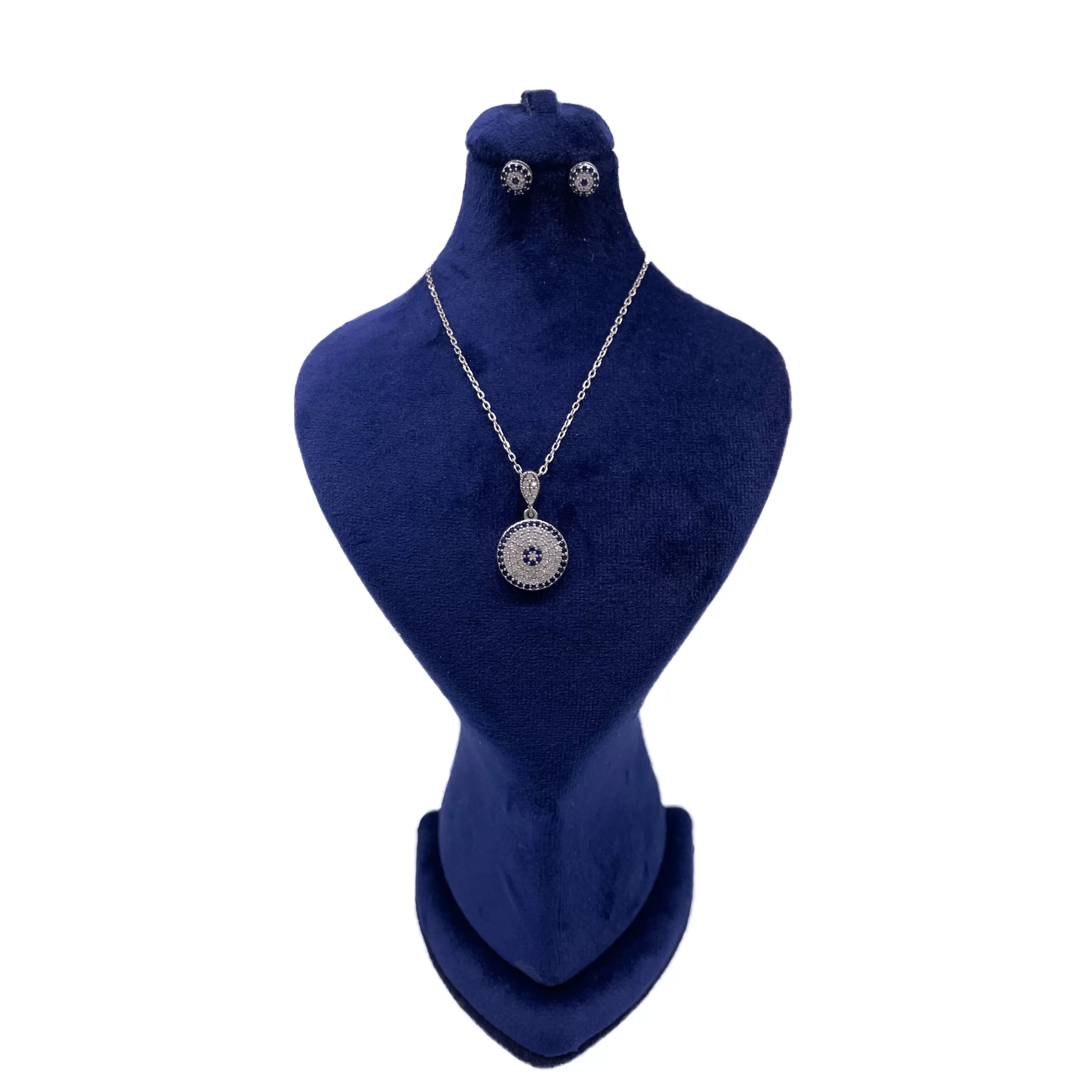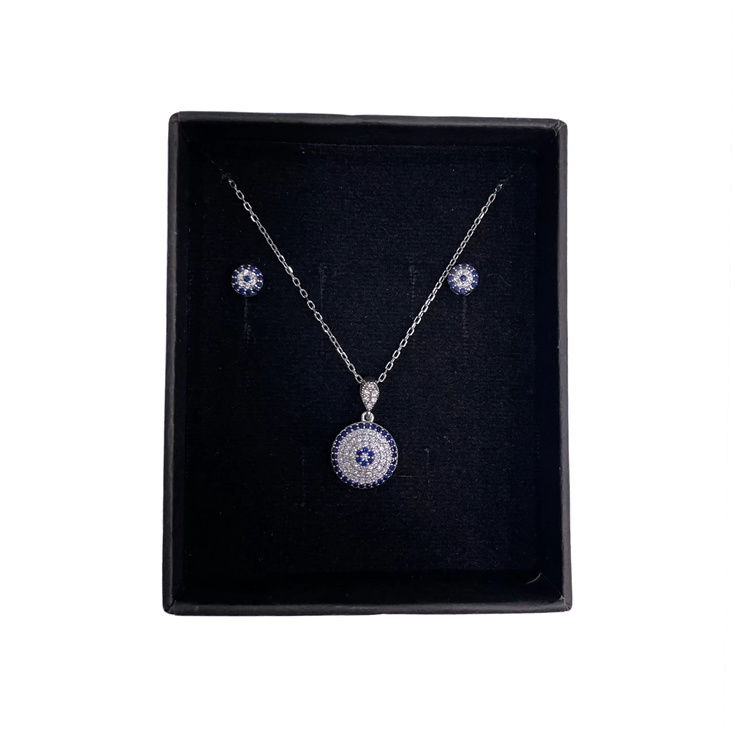 نیم ست زنانه نقره طرح چشم نظر درشت جواهر آب رادیوم همراه با نگین های اتمی سفید و کبود طرح چشم نظر جواهری بدون زنجیر