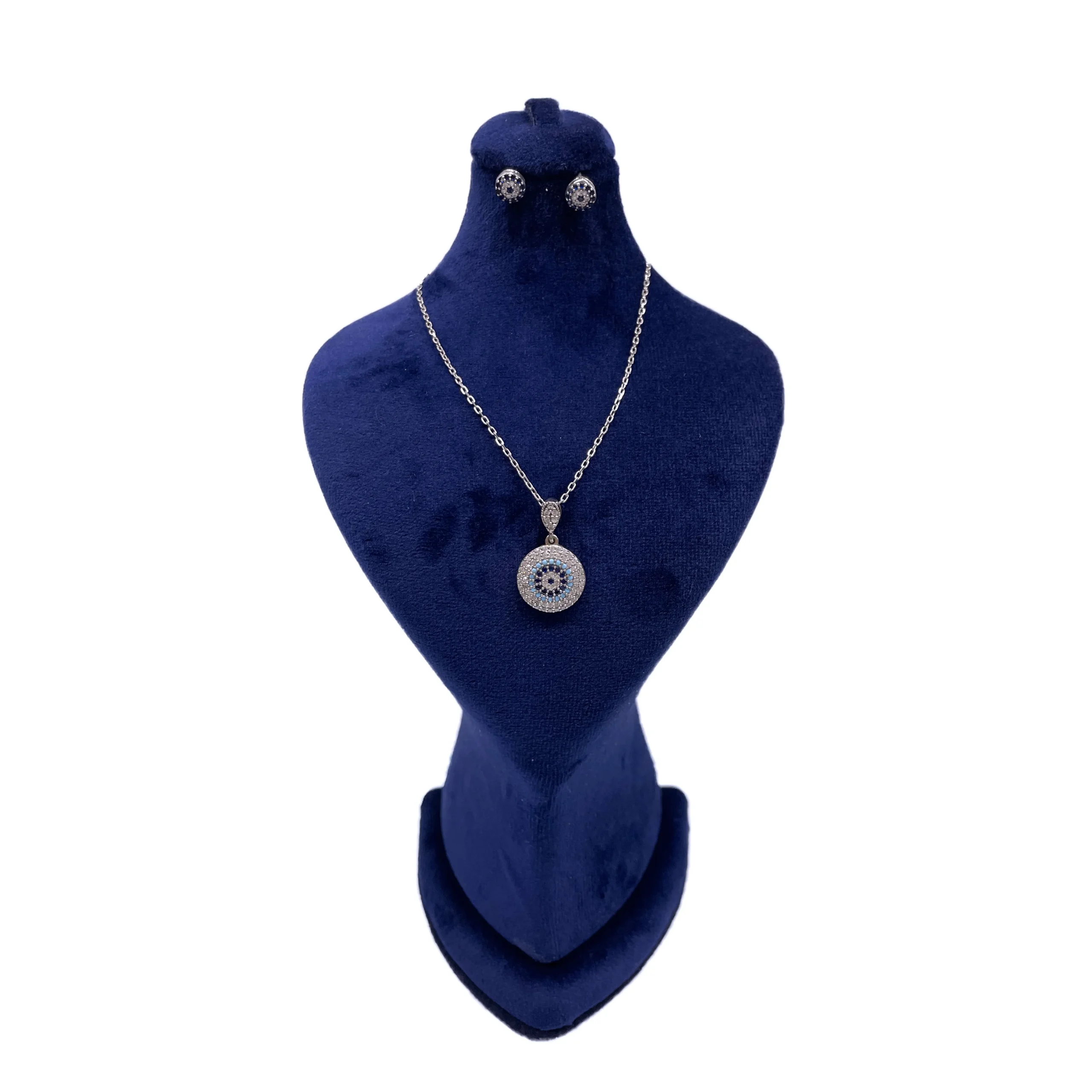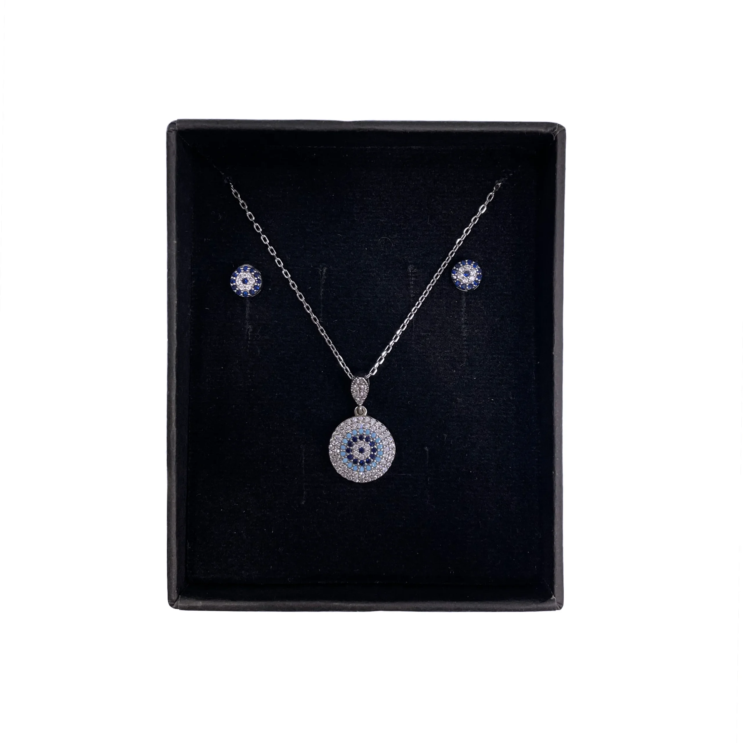 نیم ست زنانه نقره طرح چشم نظر فیروزه ای دو رنگ جواهر آب رادیوم همراه با نگین های اتمی سفید و فیروزه ای و کبود طرح چشم نظر جواهری بدون زنجیر